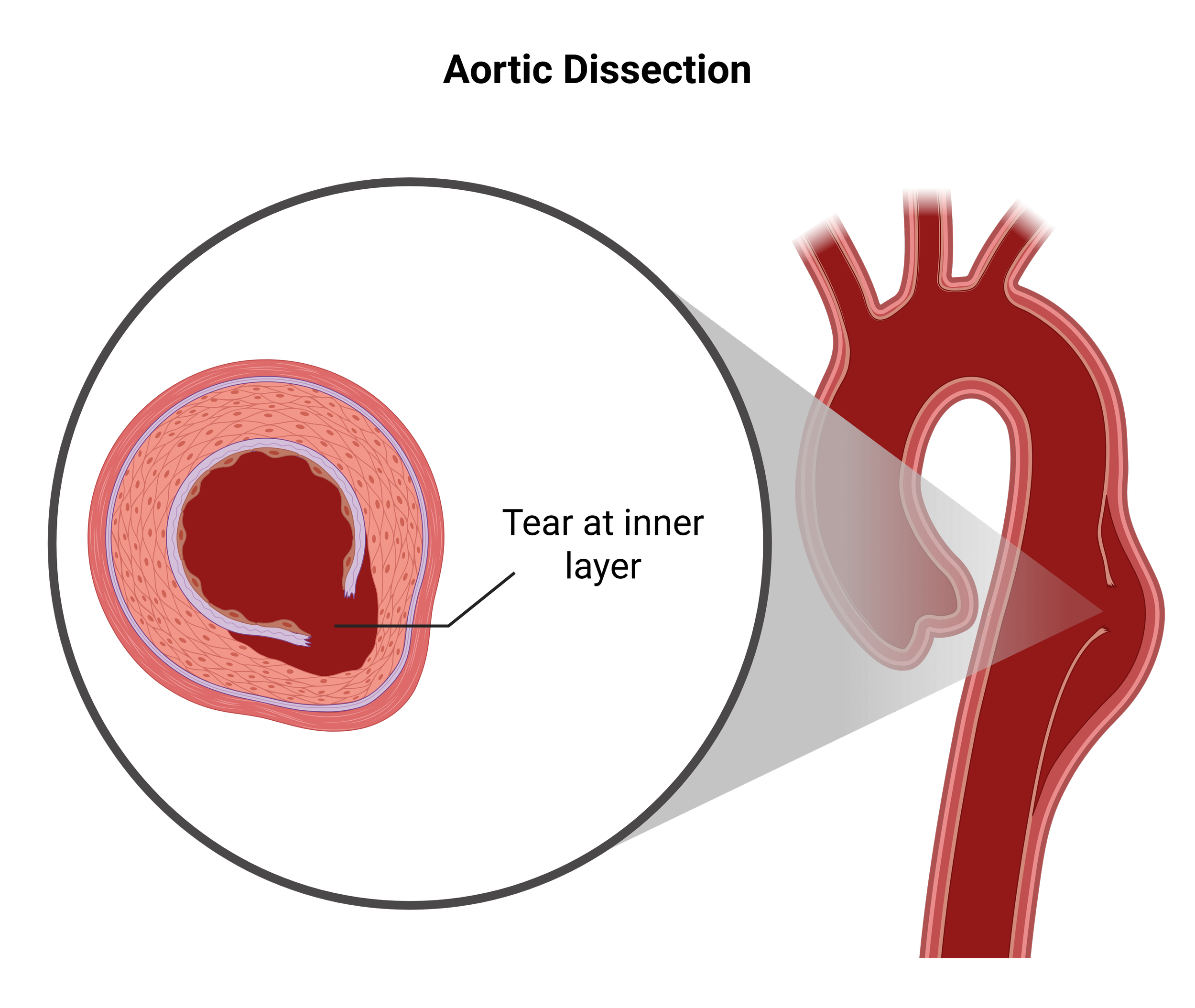 Dissect: A tear develops inside the wall of the aorta, splitting its layers apart (aortic dissection).